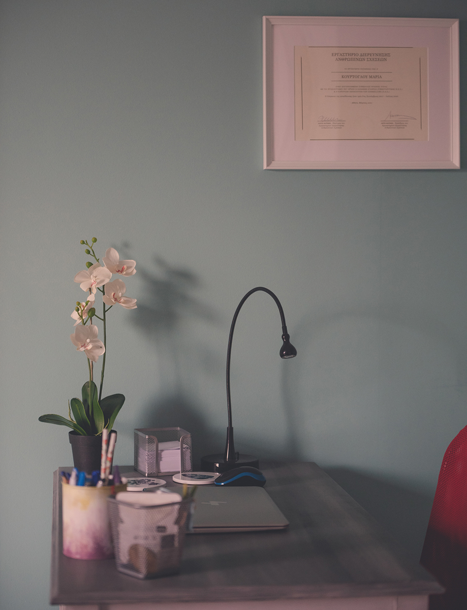 Το γραφείο μου είναι ένας χώρος έμπνευσης και δημιουργίας για μένα. Η επιθυμία μου ήταν να δημιουργήσω ένα χώρο που θα αποπνέει ζεστασιά, ηρεμία και οικειότητα ώστε οι άνθρωποι που με επισκέπτονται να βρουν ένα ασφαλές καταφύγιο για το ταξίδι τους προς την προσωπική και επαγγελματική εξέλιξη.